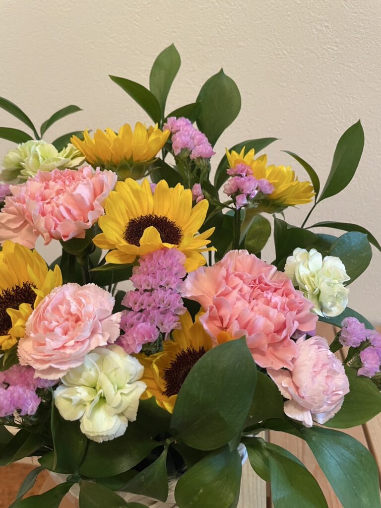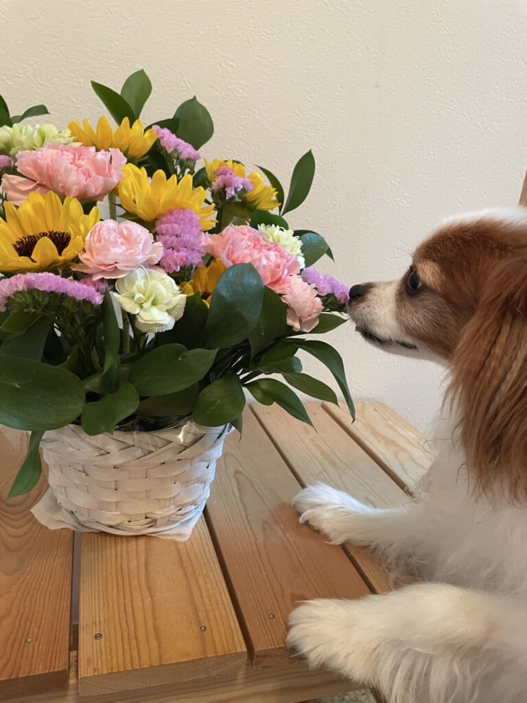 尊敬する元職場の上司からフラワーアレンジメントをいただきました。今は近所の犬の散歩メンバーですが、近況を報告したり、果物の苗をいただいたりと家族全員でお世話になっています。